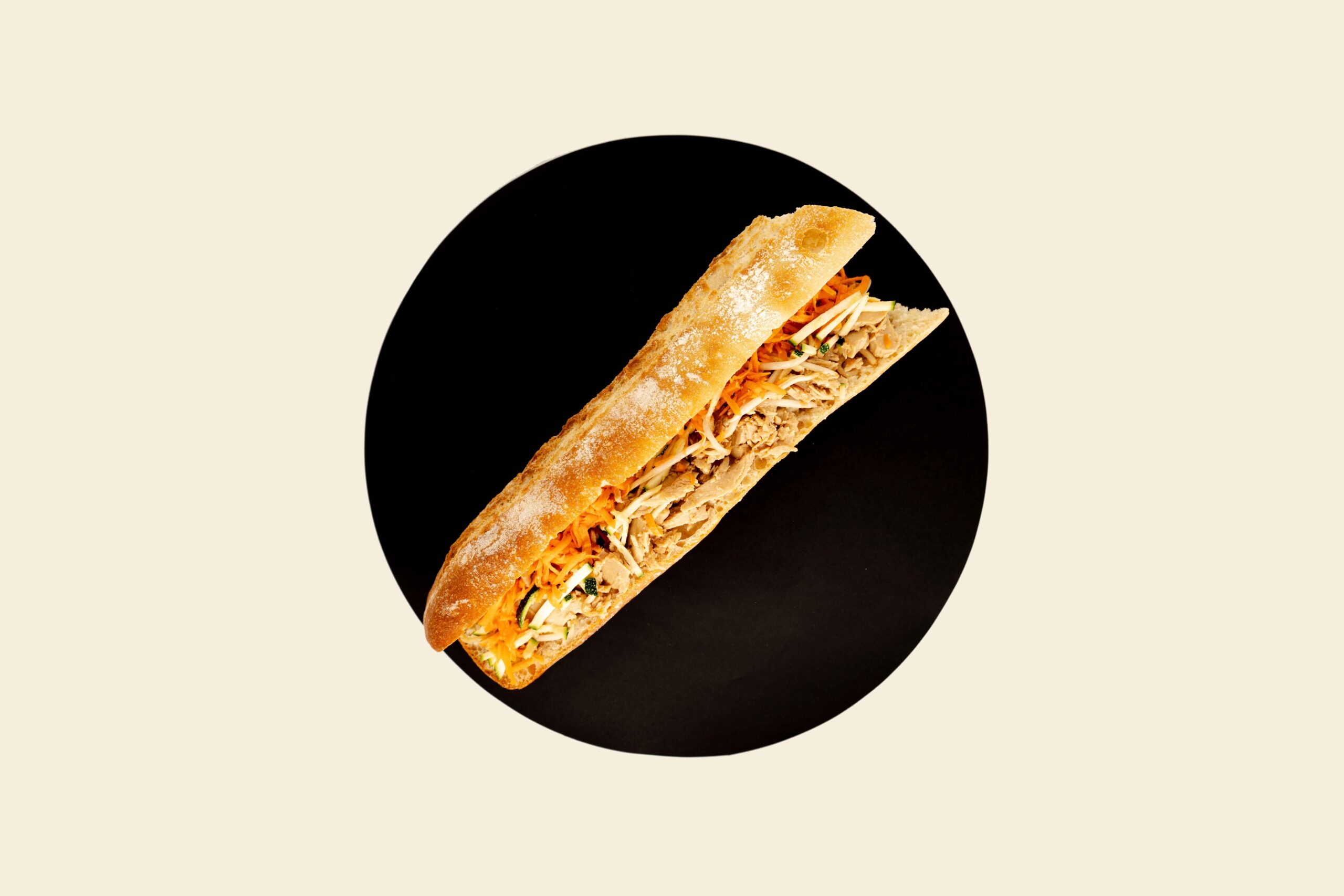 Lanières de poulet, carottes, courgettes, projections de soja et huile de sésame.