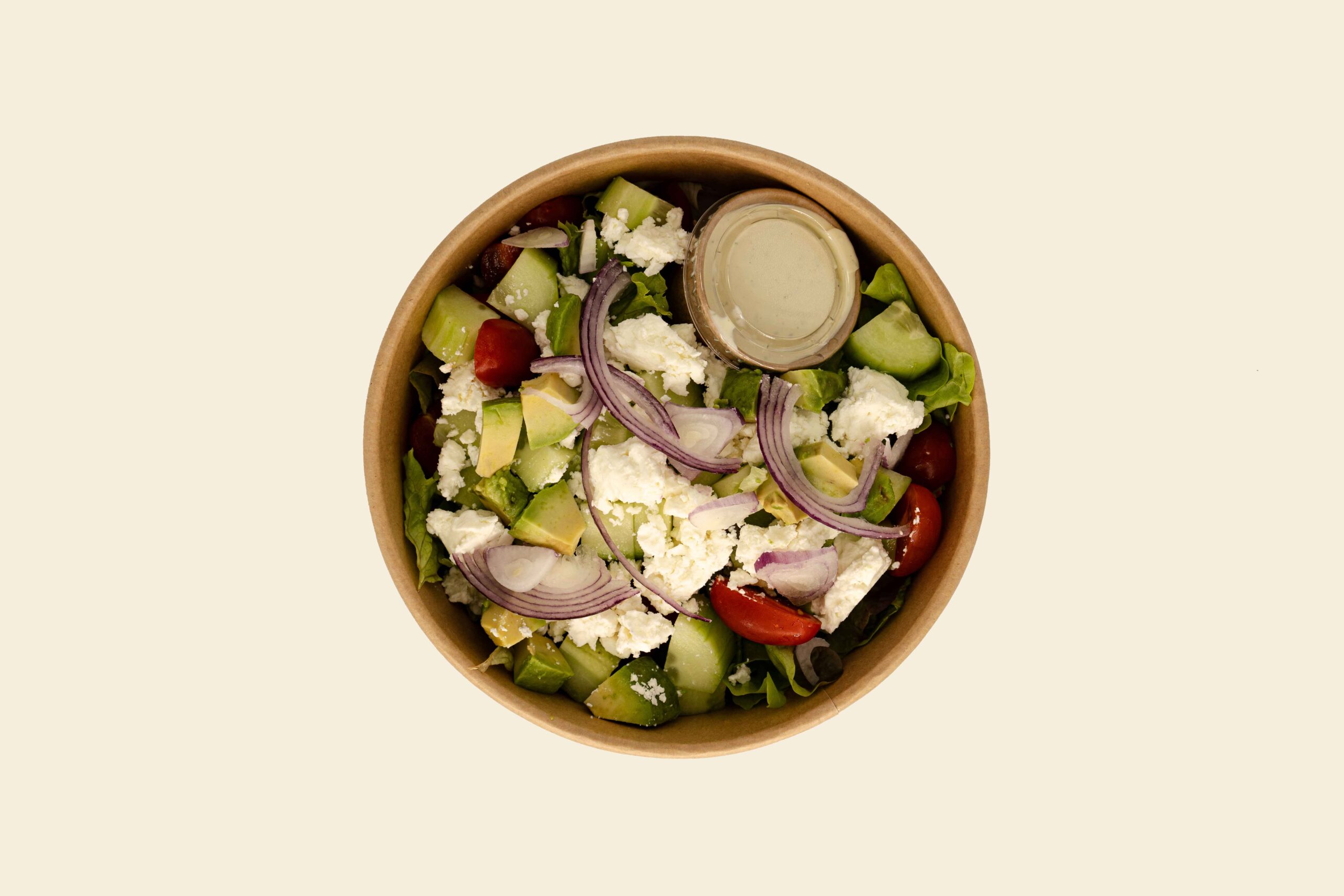 Mixed salad, diced cucumber and avocado, cherry tomatoes, olives, feta and slices of red onion. White vinaigrette.