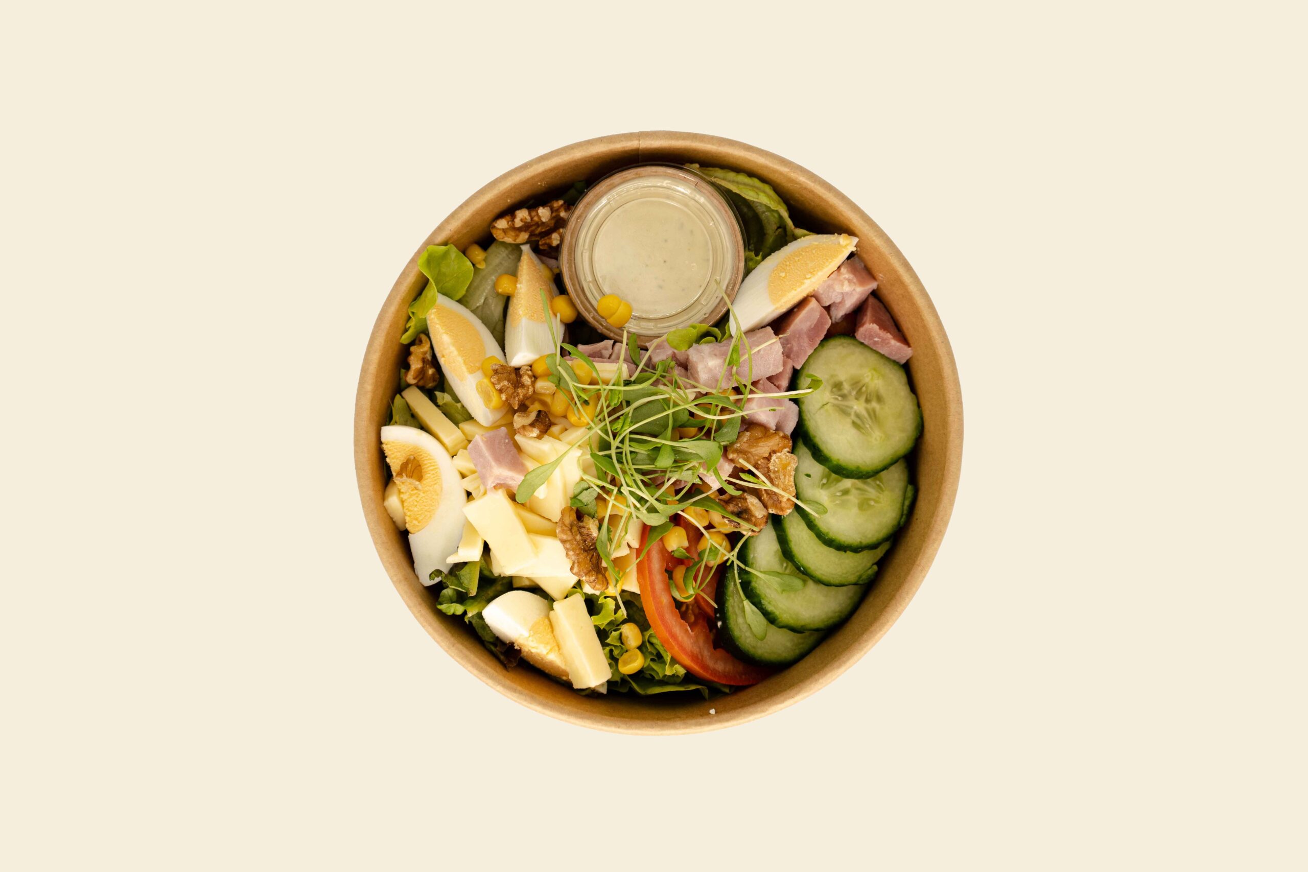 Ham, cheese, slices of cucumber and tomatoes, corn, and hard-boiled eggs, nuts. White herb vinaigrette.