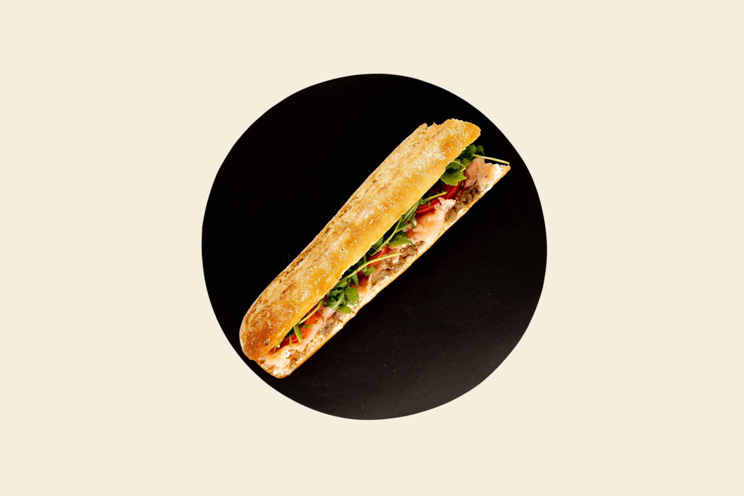 Smoked salmon, fresh cheese, eggplant caviar, tomatoes and arugula.